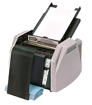 The Martin Yale 1501X is a high-speed paper folding machine that automatically feeds and folds a stack of documents without any hassle. The tabletop design effortlessly fits in any office, mailroom, school, or organization. The automatic feed tray can accommodate up to 150 sheets of paper, and you can also manually fold sets of up to 3 sheets by hand-feeding the sheets into the feed table bypass and fold up to 7,500 sheets per hour. The auto folder can accept both letter and legal-sized documents starting at 3.5″ x 5″.