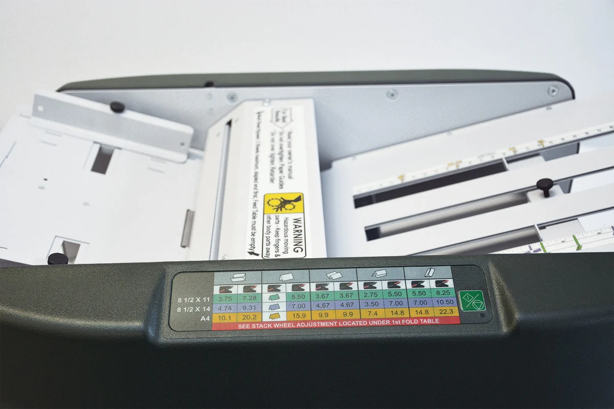 The Martin Yale 1611 makes paper folding extremely easy and efficient through the automatic feeding, folding, and stacking process, without the need for fanning. Enhanced precision paper screw adjustment keeps the folds crisp and accurate for professionally looking folded documents. This folding machine by Martin Yale offers great value with features such as auto jam detection, easy access to rollers, improved stacking wheels, and self-centering paper guides.