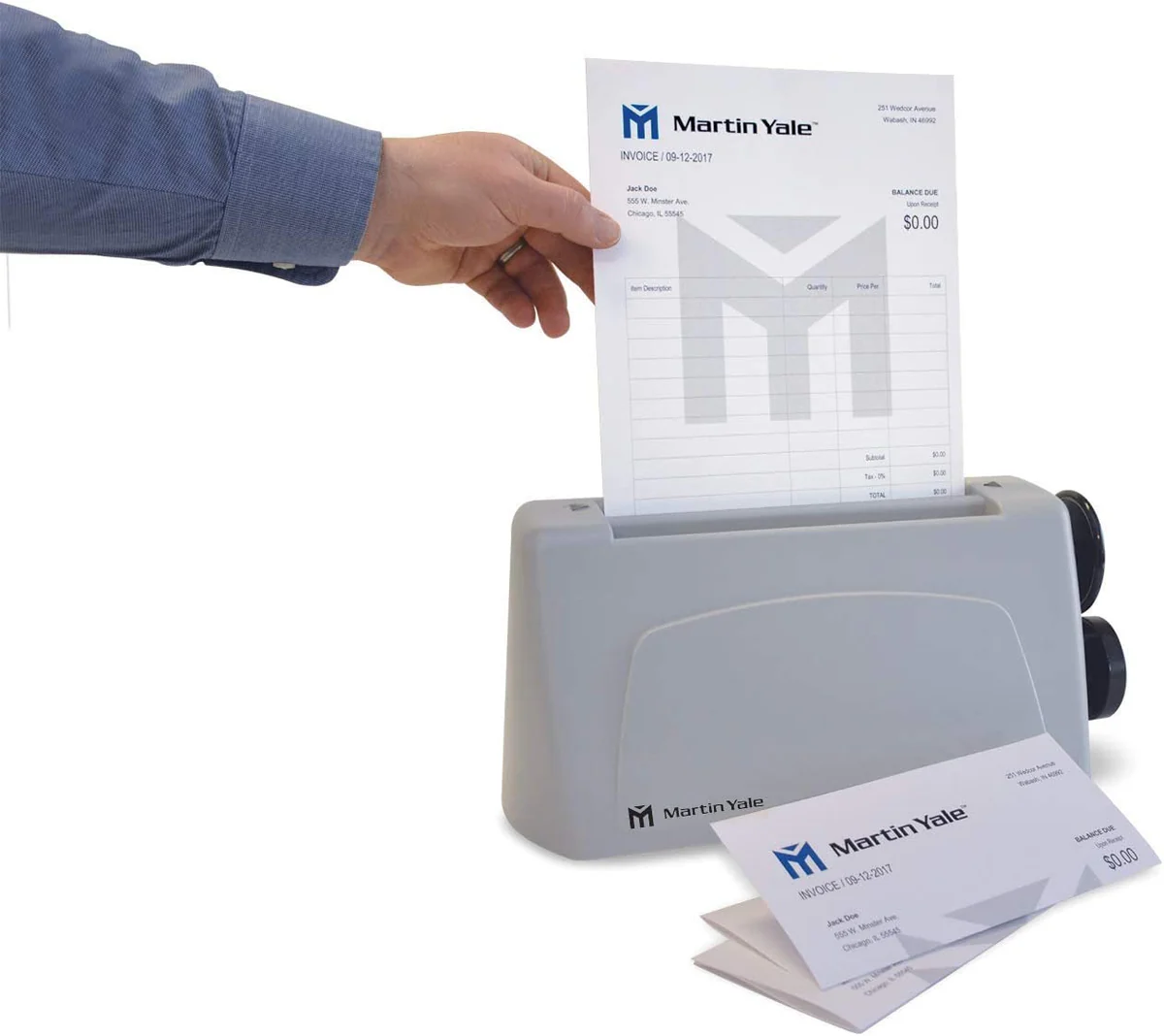 The Martin Yale P6400 Desktop Letter Folder is a hand-fed machine that folds 1 to 3 sheets into a letter fold or 1 to 5 sheets into a half fold in seconds. The compact desktop design takes very minimal space allowing the users to conveniently fold letters whenever needed. Simply insert the documents into P6400, and it ejects perfectly folded and ready to go into a standard envelope.