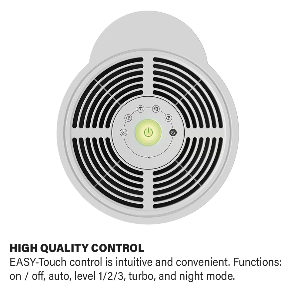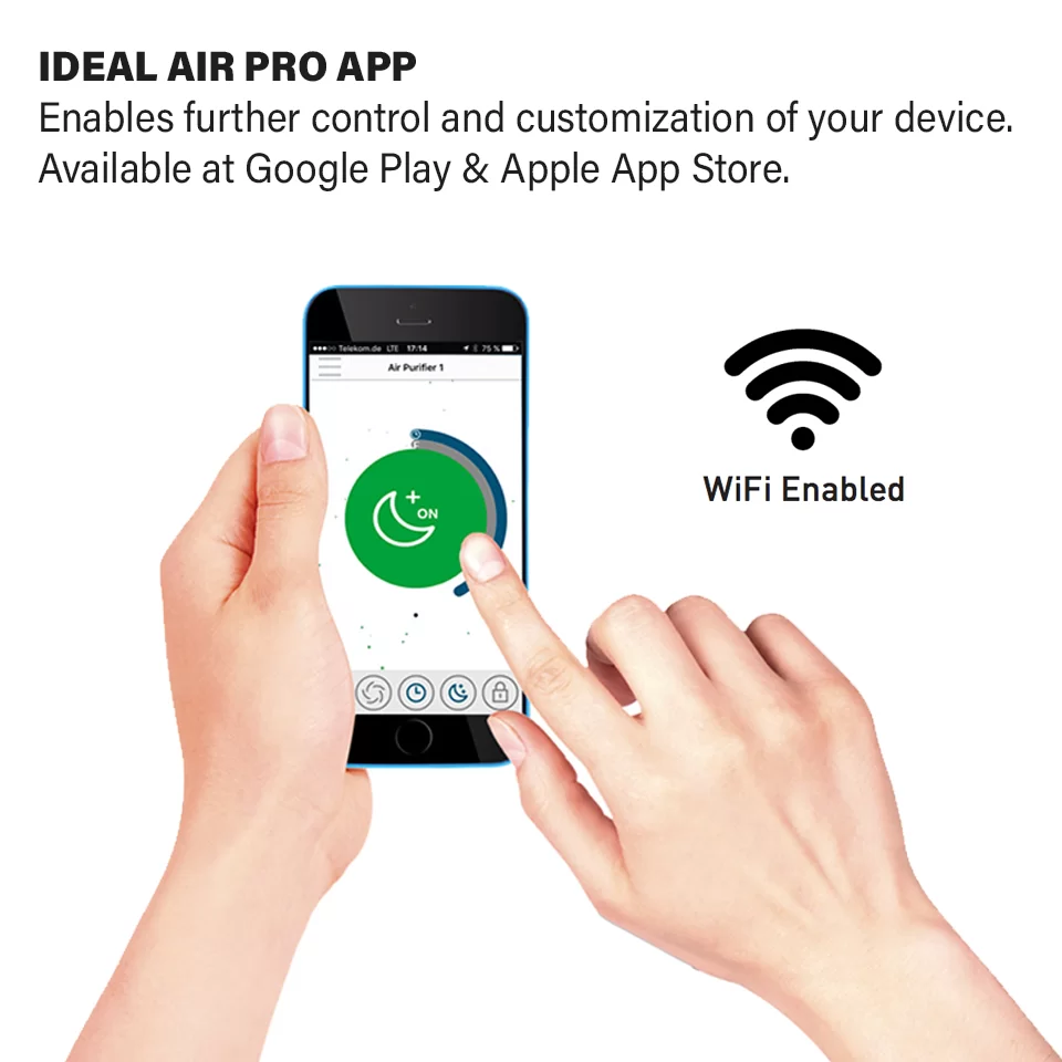 The IDEAL AP40 PRO air purifier is perfect for rooms up to 400 square feet, making it an excellent choice for bedrooms and small commercial offices. Featuring a 360° multi-layer filter system, it combines HEPA technology with specialized activated carbon for superior air purification. CARB-certified, it meets California’s strict air quality standards. The EASY-Touch control panel offers intuitive operation with on/off, auto, levels 1/2/3, turbo, and night mode. Air quality is indicated via a color-coded LED display. The 360° filter includes a prefilter, true HEPA, and activated carbon, plus RFID for easy filter changes. Control via the IDEAL AIR PRO app.