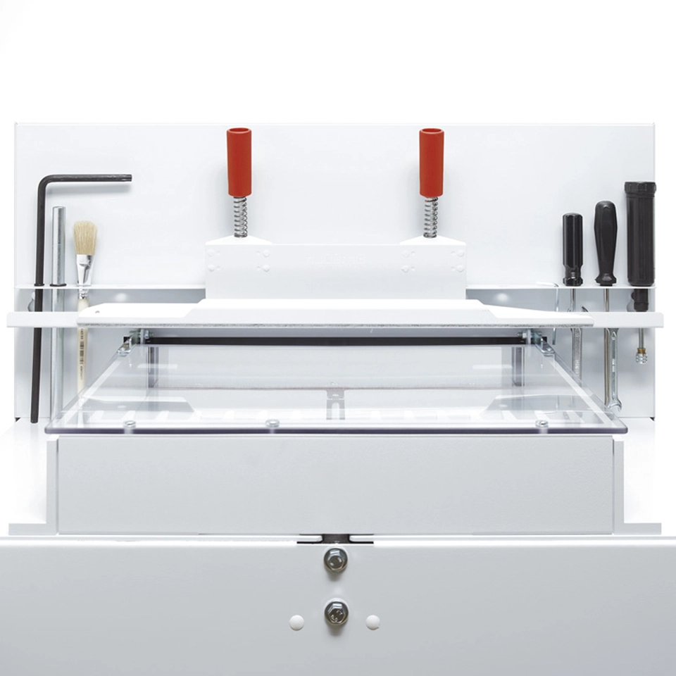 The MBM Triumph 4855 programmable paper cutter offers advanced, precise, high-volume cutting functionality. Equipped with an automatic clamp and power back gauge, it ensures fast and accurate cuts for various paper sizes. The user-friendly digital touchpad allows for easy programming and control, streamlining operations and enhancing efficiency. Perfect for offices, print shops, and commercial environments, the Triumph 4855 paper cutter provides consistent, high-quality results with minimal effort. Built for durability and reliability, this cutter is ideal for businesses seeking a powerful solution for large-scale paper cutting with precision and ease.