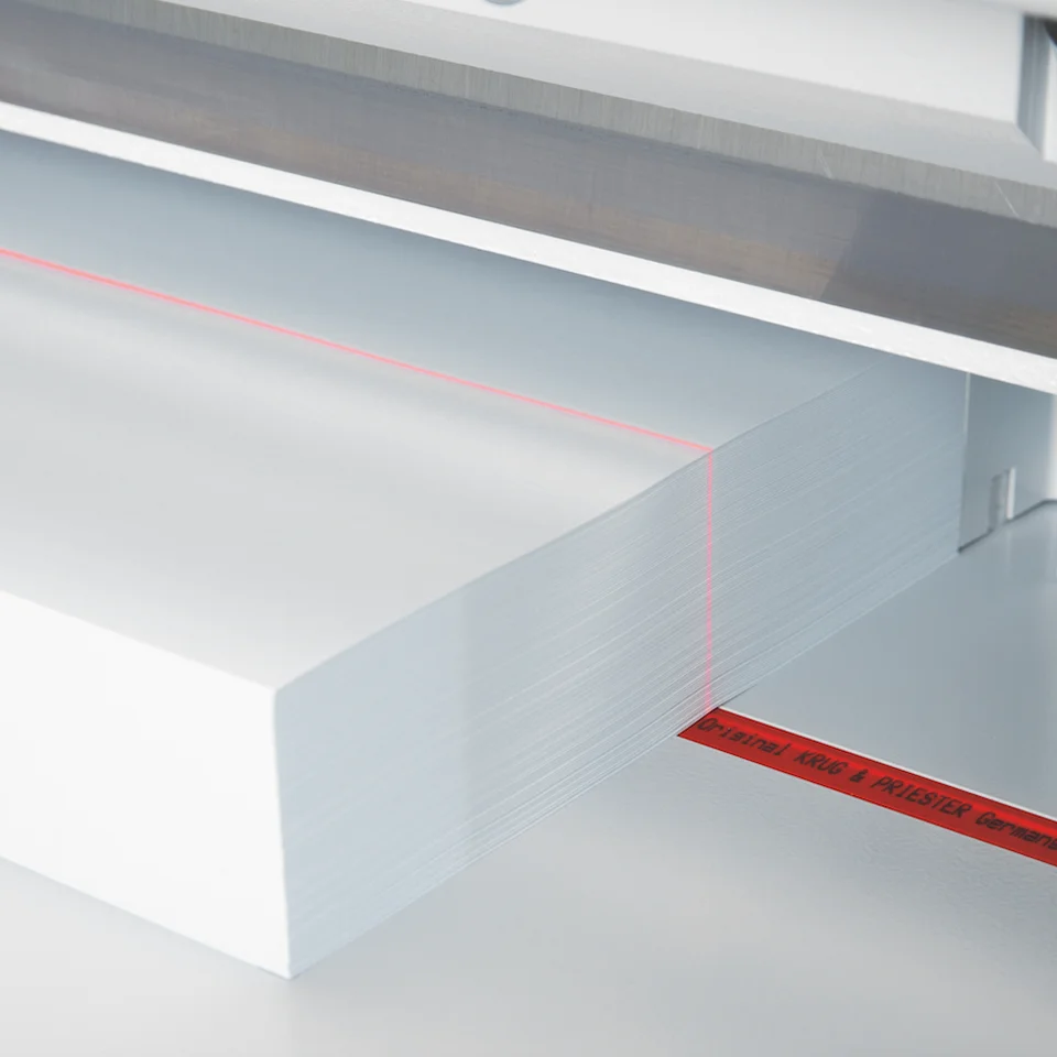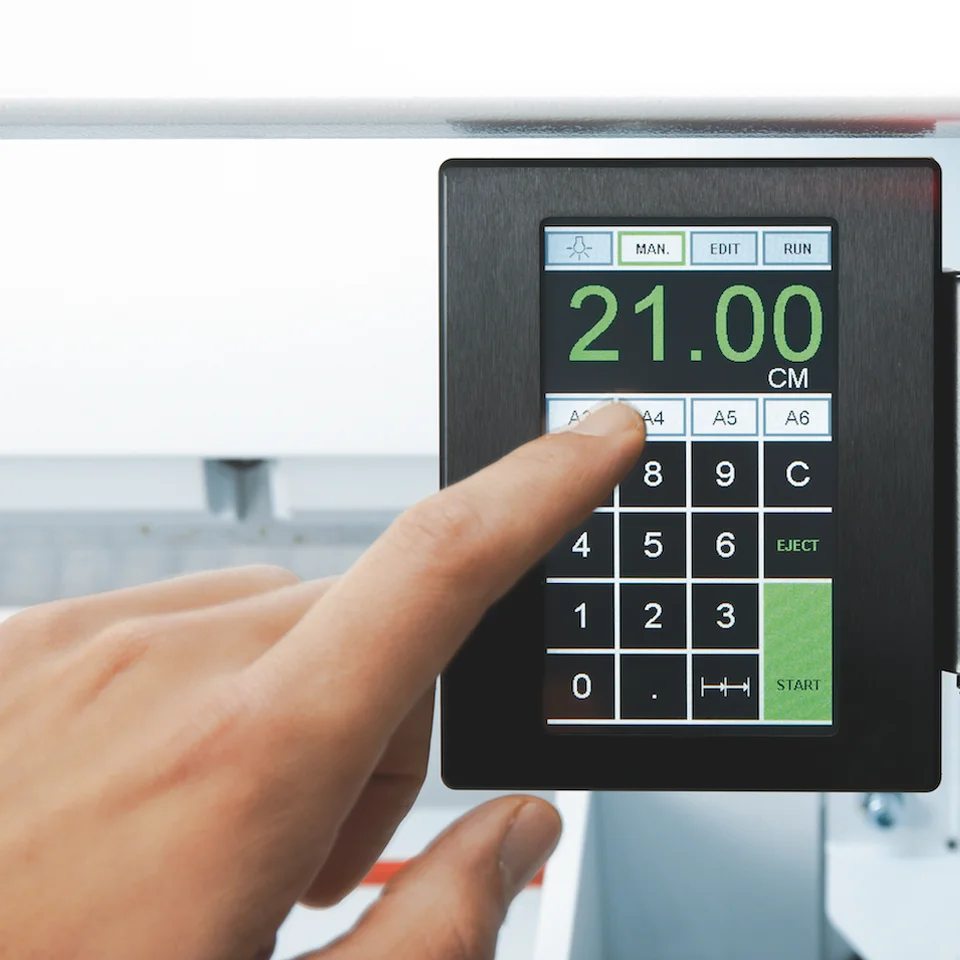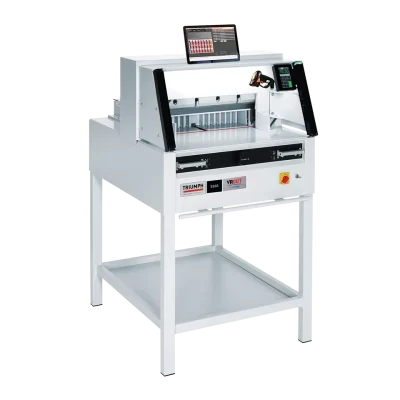 The VRCut Ready Triumph 5260 Paper Cutter is a powerful, programmable electric cutter designed for precision and efficiency. With a cutting width of 20 3/8 inches and a maximum height of 3 inches, it can handle various paper sizes. Key features include an automatic clamp, an electric back gauge, and a digital touchpad for easy programming. The Triumph 5260 paper cutter can store up to 99 programs and supports narrow cuts as small as 1 3/8 inches, making it highly versatile. Designed for ergonomic operation, the paper cutter is equipped with German steel blades, LED optical cutting lines, and a patented safety drive. These features ensure smooth, safe, and accurate cuts, making this paper cutter ideal for high-volume environments.