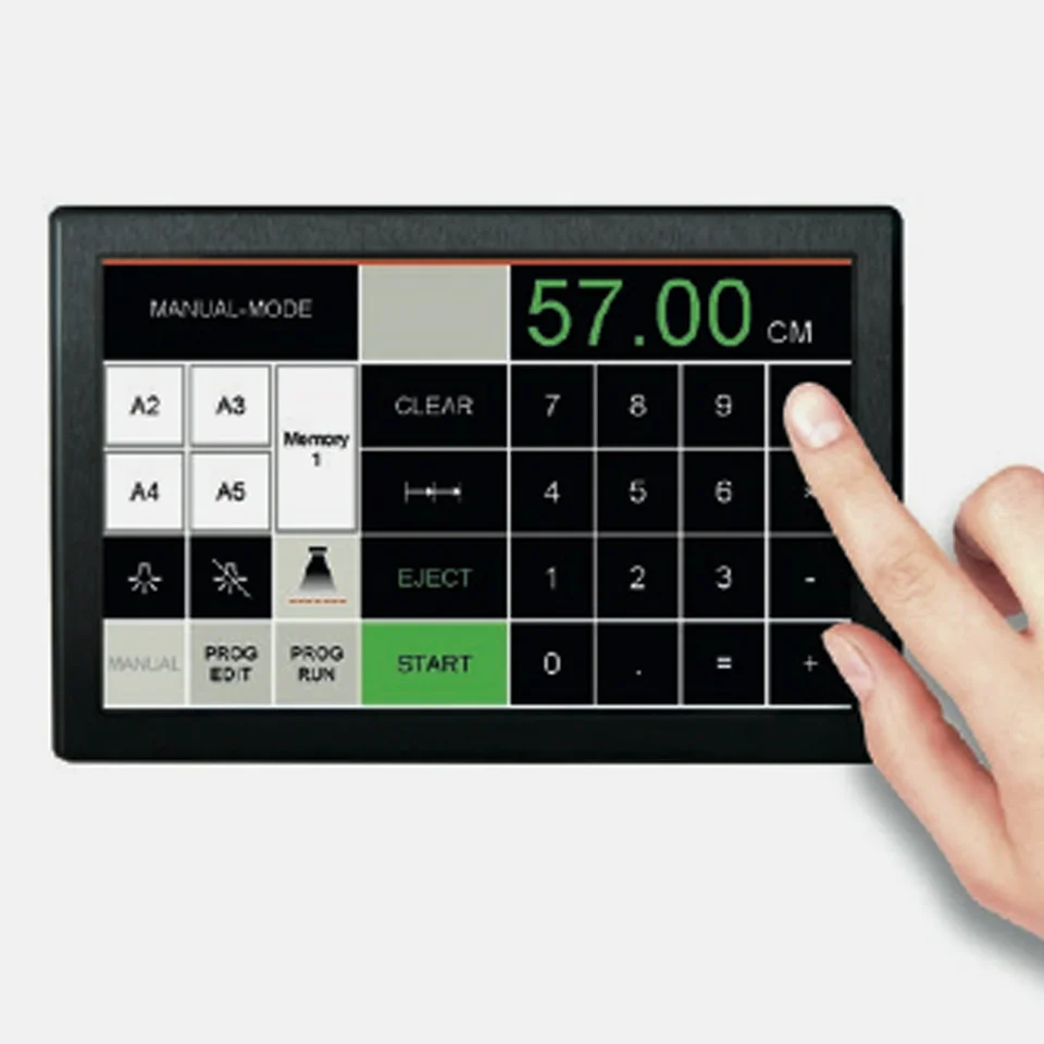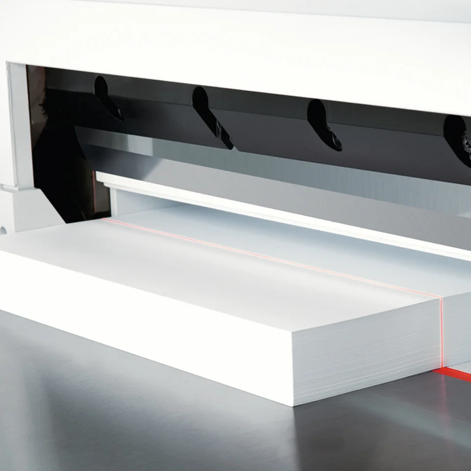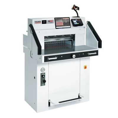 The MBM Triumph 5560 and 5560 LT programmable paper cutters deliver exceptional precision and reliability for high-volume cutting tasks. Equipped with a hydraulic blade and clamp drive, these cutters ensure smooth, accurate cuts every time. The power back gauge and digital touchpad simplify programming and operation, while the IR safety light beams on the front table enhance user safety. The 5560 LT paper cutter model comes with front and rear air tables (available by special order), providing additional support for larger jobs. Ideal for offices, print shops, and commercial settings, these durable cutters offer top-notch performance and precision for all paper-cutting needs.