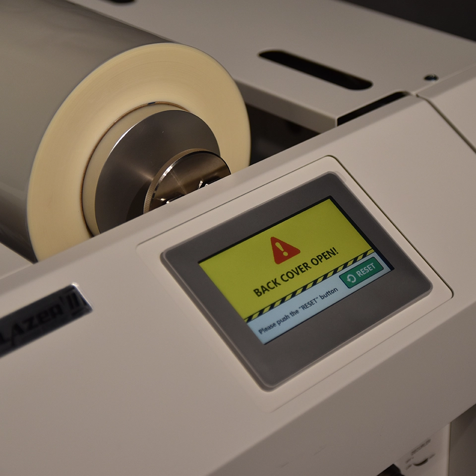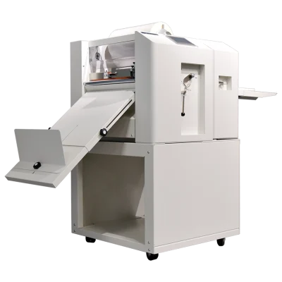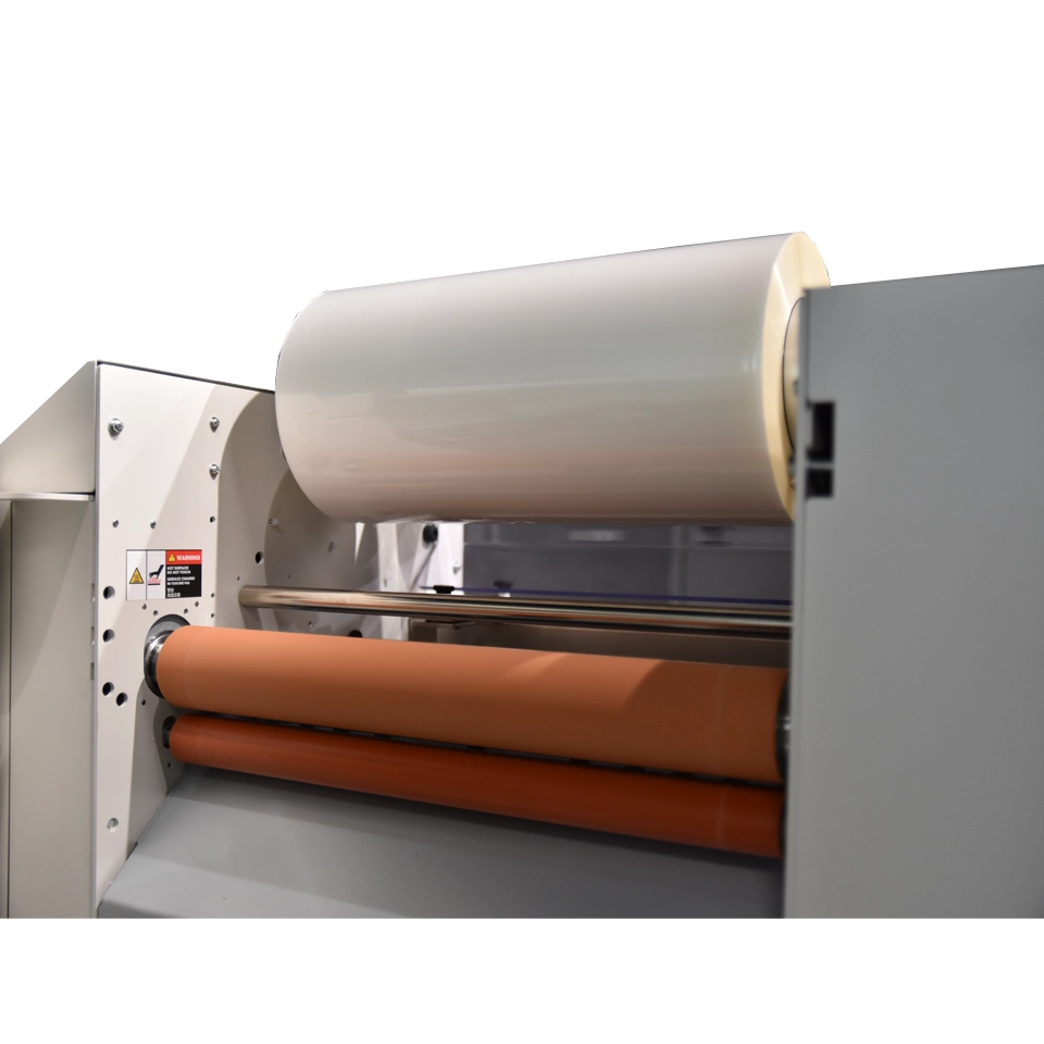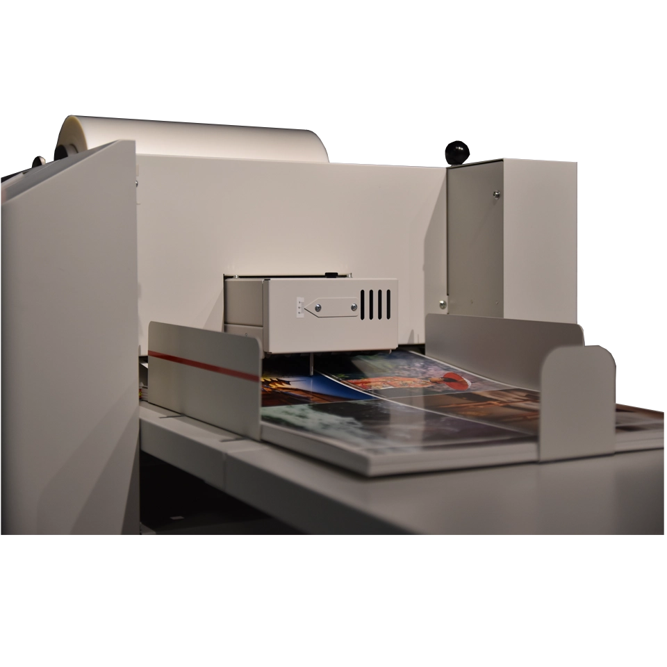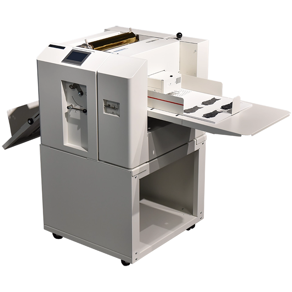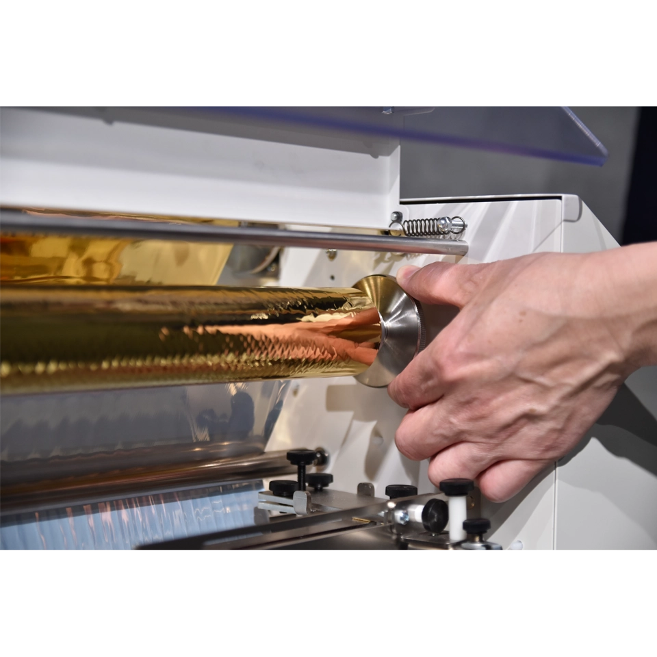 The MBM Laminator and Foil Fuser, Foilglazer II, is a compact and robust single-sided laminating and foil-fusing machine, ideal for laminating and embellishing digitally printed, short-run jobs. It accommodates paper sizes up to 14.3” x 23.6” and features an easy-to-use 4.3” color touch screen with an inching switch and pressure roller lifting lever. The automatic air suction feeding system ensures consistent feeding for various print stocks, ranging from 110gsm to 400gsm, and various laminating films. Ideal for on-demand foil fusing, it works with any color foil rolls on black toners to enhance digital prints. The Foilglazer II offers intuitive operation, with a maximum laminating speed of 16.4 ft/min and 9.84 ft/min for Foilglazing. It also features an automatic film cutting mechanism for efficient, hands-free operation.