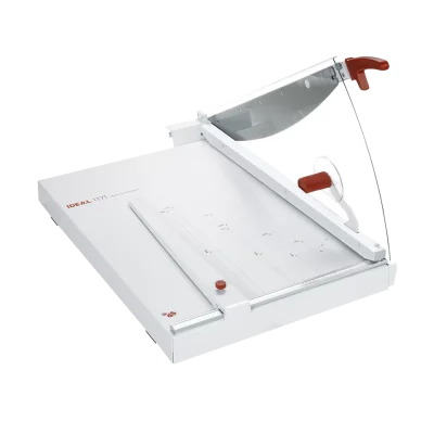 The Triumph 1171 Professional Tabletop Paper Trimmer offers precision cutting with a 28″ cutting length and a resharpenable Solingen steel blade. Designed for safety and accuracy, it features a stationary safety guard, solid manual clamp, precision side lay, and an adjustable back gauge. Built with durable all-metal construction, this paper trimmer ensures reliable, long-lasting performance. Made in Germany, it delivers superior quality and is ideal for high-volume professional use. The Triumph 1171 provides smooth, accurate cuts, making it an essential tool for workspaces that require precision and safety in every trim.