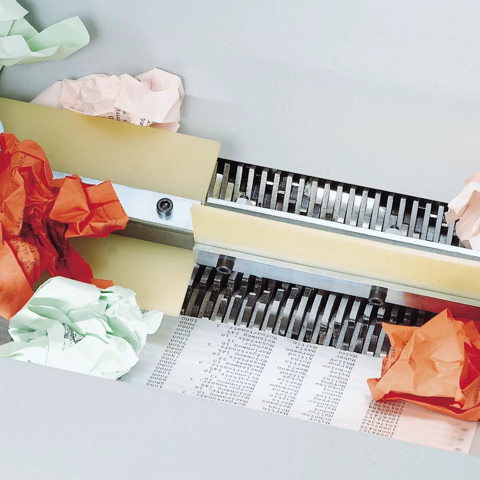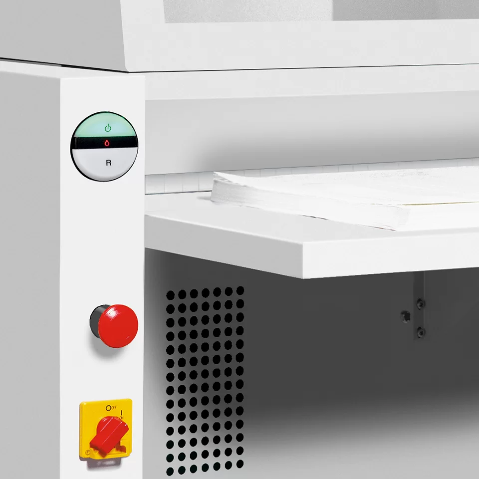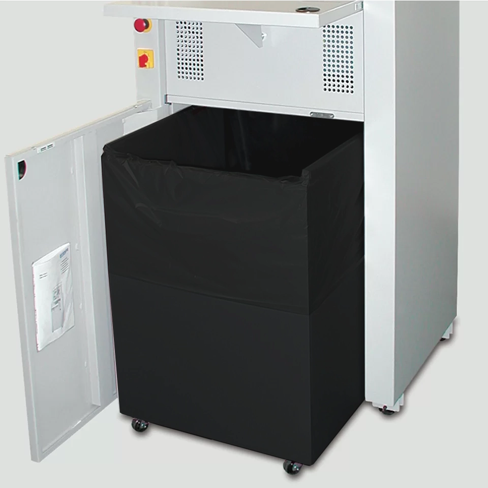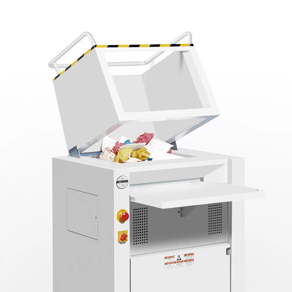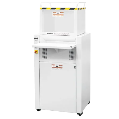 The MBM Destroyit 4606 Paper Shredder is a space-saving, high-capacity shredder designed for large-volume, secure document destruction. Featuring a unique feed hopper for bulky materials and a conventional feed slot for flat paper stacks, it efficiently handles crumpled paper with a feeding paddle. The intelligent EASY SWITCH control indicates operational status with color codes and symbols. Equipped with a powerful three-phase motor, automatic oiler for consistent performance, and thermal motor protection, this shredder ensures durability and reliability. The mobile, high-volume container is easy to remove, and safety features like automatic stop prevent overfeeding, making the Destroyit 4606 perfect for demanding office environments.