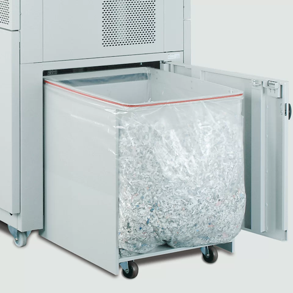 The MBM Destroyit 5009 Paper Shredder is a powerful conveyor-fed shredder designed for high-volume, secure document destruction. With a sheet capacity of over 600 and a 79-gallon shred volume, it efficiently handles large quantities of paper. The optional exit conveyor belt system increases shred capacity by transporting material to an external container. Featuring a centralized oiler for cutting shaft lubrication, an electronically controlled safety guard, and multiple safety features, this shredder ensures smooth and secure operation. The dual 3-phase motors (24 horsepower) and soft metal-resistant hardened steel cutting shafts can shred CDs, DVDs, hardbound documents, and 3-ring binders, making it ideal for heavy-duty use.